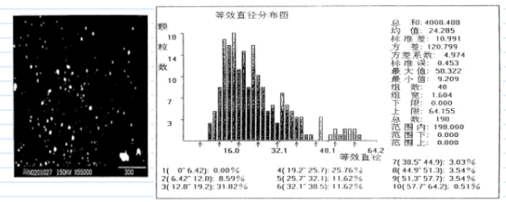 本產品由北京市海淀區產品質量監督檢驗所依據北京市質量監督局《納米材料質量檢驗評價規則》進行檢測,測試透射電鏡照片如圖5所示,照片中呈現出分散均勻的納米粉體。該產品為100%納米粒子。顆粒平均粒徑為24nm,粒徑分布范圍在6~66nm,其中有%顆粒粒徑分布在6~40nm范圍。該產品在水處理、凈化空氣、抗菌防霉、屏蔽紫外線等方面,都顯示出很好的功能。